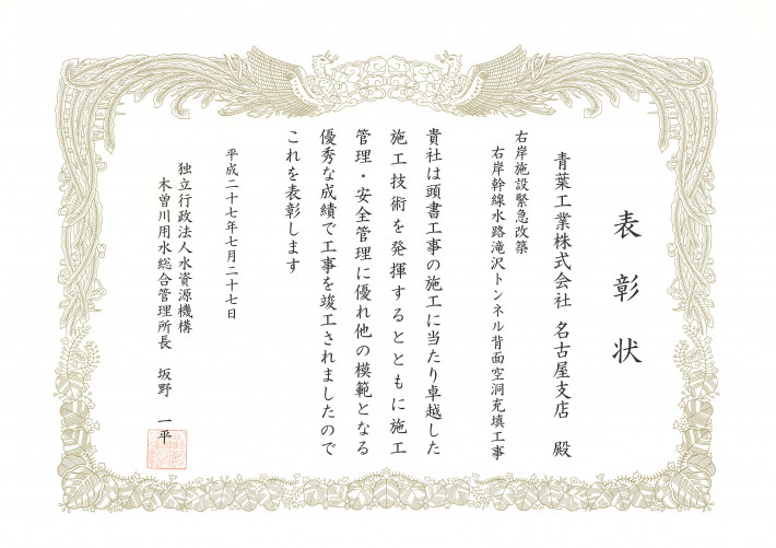 弊社名古屋支店で施工しておりました、独立行政法人水資源機構発注の「右岸施設緊急改築 右岸幹線水路滝沢トンネル背面空洞充填工事」について、卓越した施工技術を発揮するとともに施工管理・安全管理に優れ他の模範となる優秀な成績であったとして優良工事表彰を受けました。