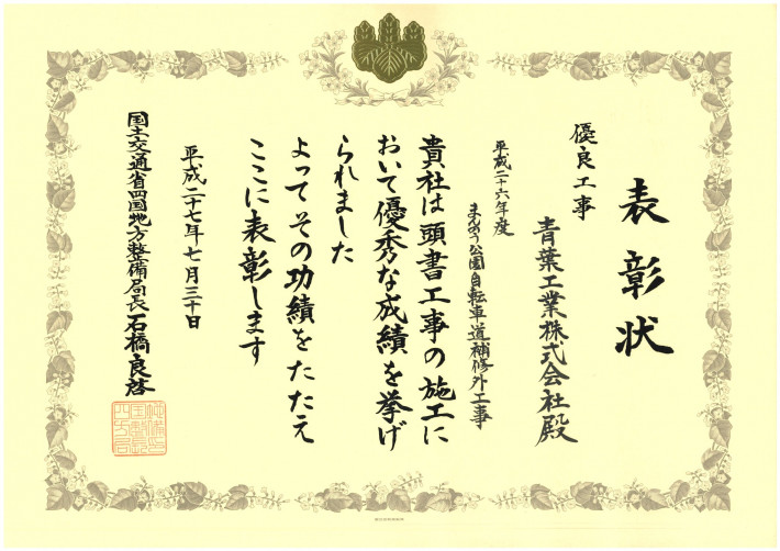 弊社が施工しておりました「平成26年度まんのう公園自転車道補修外工事」について、国土交通省 四国地方整備局 香川河川国道事務所長より優良工事表彰を受けました。
