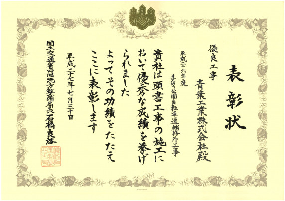 弊社が施工しておりました「平成26年度まんのう公園自転車道補修外工事」について、国土交通省 四国地方整備局 香川河川国道事務所長より優良工事表彰を受けました。