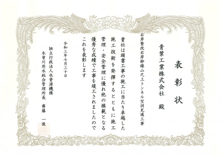 弊社名古屋支店で施工しておりました「右岸緊改右岸幹線山之上トンネル空洞充填工事」について、独立行政法人水資源機構 木曽川用水総合管理所長より優良工事表彰を受けました。