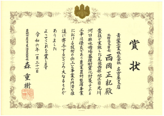 愛知県海部郡飛鳥村で施工しておりました、東海農政局発注の「尾張西部地区 日光川河口排水機場基礎耐震化対策その6工事」について、様々な創意工夫により効率的かつ高品質な施工に努めるとともに、工期内に安全かつ確実に工事を完了させたことを評価され、東海農政局長より優良工事表彰を受けました。