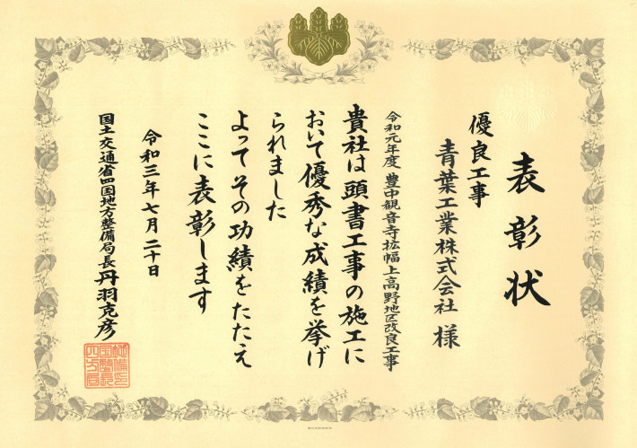 香川県三豊市で施工しておりました「令和元年度 豊中観音寺拡幅上高野地区改良工事」について、国土交通省 四国地方整備局長より優良工事表彰を受けました。