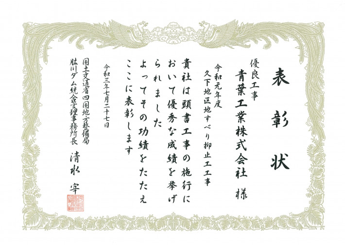 愛媛県大洲市で施工しておりました「令和元年度 久下地区地すべり抑止工工事」について、国土交通省 四国地方整備局 肱川ダム統合管理事務所長より優良工事表彰を受けました。